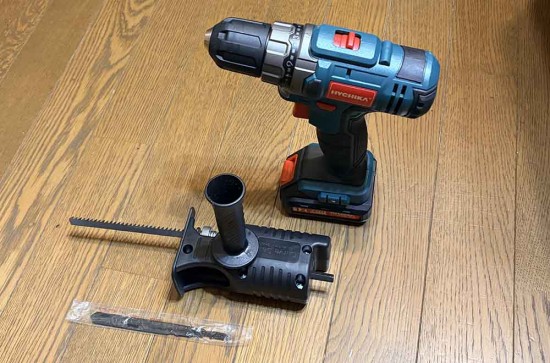このアタッチメントを付けると、電動ドリルが電動ノコギリ、いわゆるレシプ