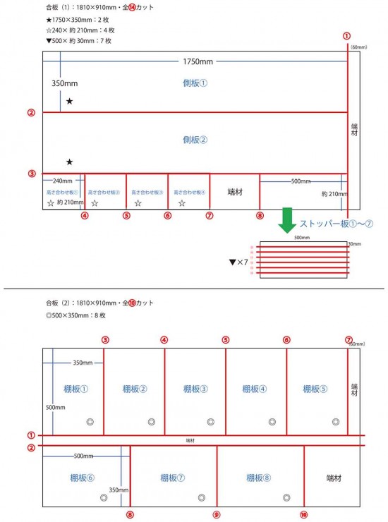 上段右下のストッパー板は、棚板の後ろに取り付け。奥行き350mm